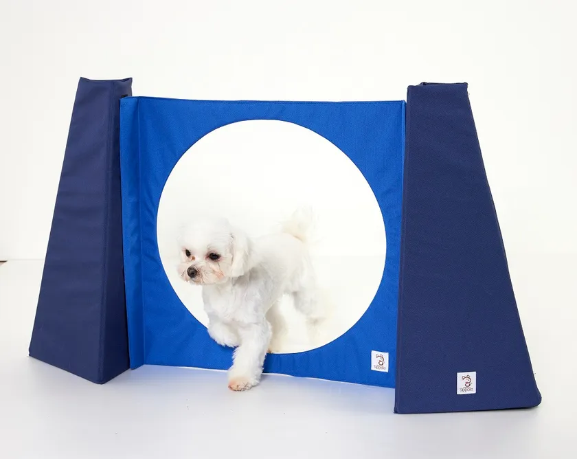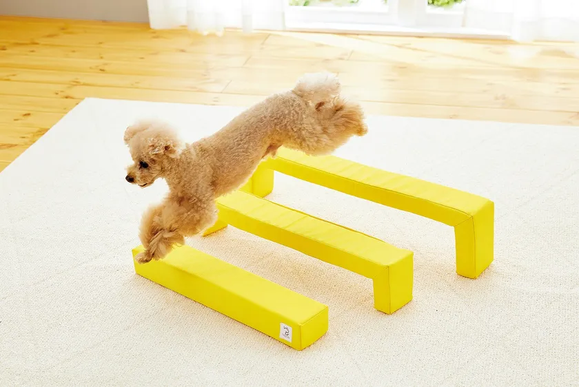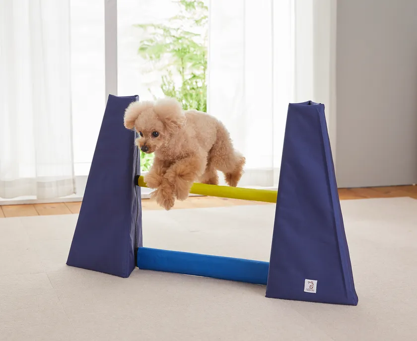 人と犬とが呼吸を合わせ、次々と障害物をクリアしていくアジリティ競技。アジリティを通して飼い主さんと愛犬が一緒に物事を成し遂げることで、関連性を強めることができます。一度はやってみたいと憧れつつも、初心者にはちょっとハードルが高いのではないでしょうか。そんなアジリティをお部屋で手軽に気軽に挑戦できます。軽くて柔らかい素材を用い、ぶつかっても安心な作りを目指しました。