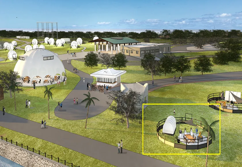 本公園を最大限に楽しむための拠点となる、球体テント等客室を整備します。最大直径約6mの球体テントは、夜に発光し幻想的な風景を作ります。他にも、ヴィラ棟、アウトドアリビング、シーサイドキャビンと様々なタイプの宿泊施設を整備し、開放感のあるプライベート空間をお楽しみいただけます。