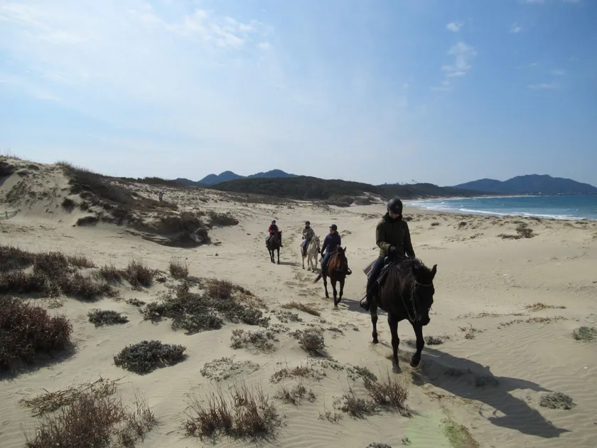 玄界灘海浜部にみられる白砂青松と青い海、志賀島方面につづく細長い地形が特徴的な“海の中道”を堪能するホーストレッキングを提供します。