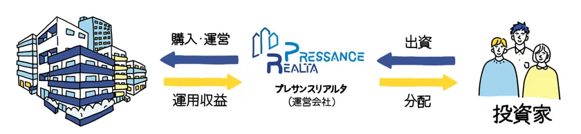 投資家(優先出資者)はプレサンスリアルタ(劣後出資者)と匿名組合契約を結び、出資金を払い込みいただきます。分配にあたっては、まず投資家(優先出資者)に、物件ごとの配当利回りに至るまで優先的に分配し、その後、残利益があった場合に、プレサンスリアルタ(劣後出資者)に分配されます。