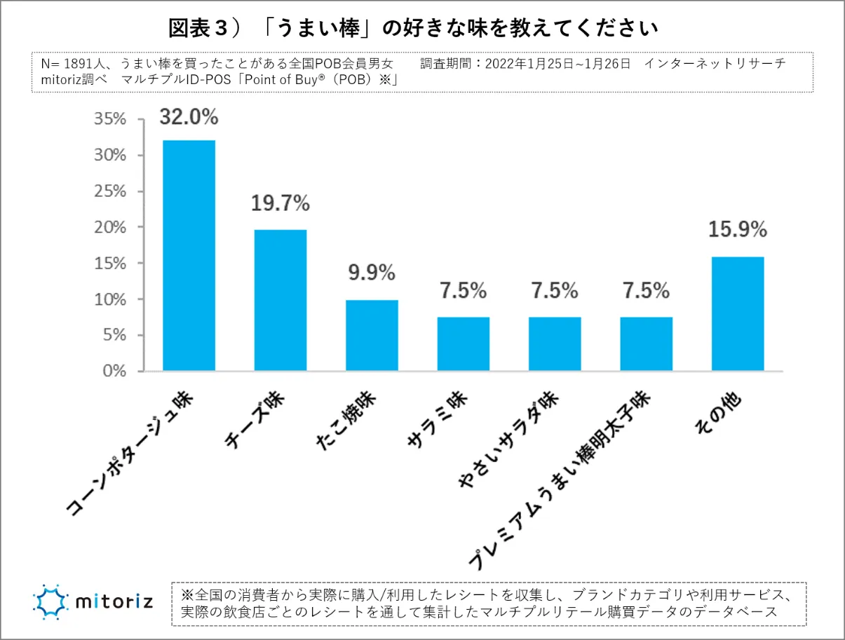 ・「うまい棒」の好きな味は、3割が1992年発売の「コーンポタージュ味(32.0%)」、1980年発売の「チーズ味(19.7%)」、1987年発売の「たこやき味(9.9%)」が続く。
