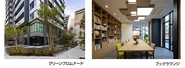 ジオタワー南森町は、梅田エリアから約1.6キロ圏内の都心にありながら、大川や大阪城公園などの緑豊かな自然を身近に感じられるエリアに位置しています。まず、周辺の街並みへの配慮として、4周道路に位置した敷地を活かし、周辺をぐるりと歩道や街路樹、植栽帯で囲い「通り」に潤いと新たな景観を創出しました。環境への配慮としては、1階共用部にwi-fi環境を整備したブックラウンジを設置し、本を読むだけでなくテレワークスペースとしても常時開放することで通勤交通に伴うCO2排出削減に貢献します。居室のすべての開口部において、空気層側に特殊金属膜(Low-E膜)をコーティングしたガラス(Low-E複層ガラス)を採用し、室内の高い断熱性能や遮熱性能を実現しました。また、省エネ性能の高い設備機器を標準設置するなどの取組みを行っています。