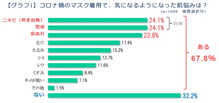 まず、マスク着用で気になるようになった肌悩みを聞いたところ、「ニキビ(吹き出物)」、「乾燥」が24.1%の同率で1位、次いで「肌あれ」の22.8%となり、何らかの悩みがある人が67.8%という結果になりました。(グラフ1)