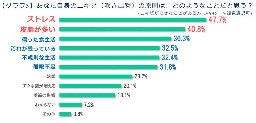これまでにニキビができたことが「ある」と回答した845名の方に、ニキビの原因と考えられることを聞いたところ、「ストレス」が47.7%で最多でした。また、食生活や不規則な生活などの生活習慣を挙げる方もおり、ストレス社会と言われる現在、生活習慣を含め、様々なストレスがニキビにも影響することが示唆されました。また、昨今はコロナ禍で行動が制限されることも多く、「ストレス」を感じる機会が増えていることも一因かと考えられます。