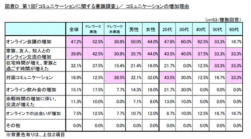 コミュニケーションの増加理由について尋ねたところ、1位「オンライン会議の増加」(回答率47.2%)、2位「家族、友人、知人とのオンライン交流の増加」(同39.6%)、3位「在宅時間が増え、家族と過ごす時間が増えた」(同32.1%)となりました。