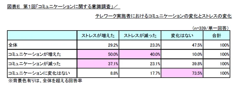 図表E 第1回「コミュニケーションに関する意識調査」/テレワーク実施者におけるコミュニケーションの変化とストレスの変化