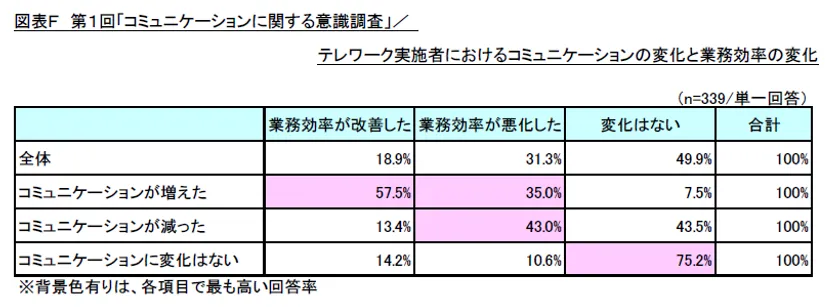 図表F 第1回「コミュニケーションに関する意識調査」/テレワーク実施者におけるコミュニケーションの変化と業務効率の変化