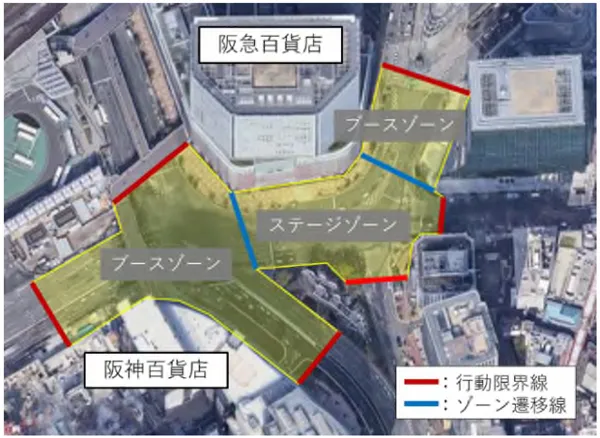 大阪・梅田にある阪急百貨店・阪神百貨店前のエリアをデジタル空間上に再現し、「ステージゾーン」と2つの「ブースゾーン」を設けます。「ステージゾーン」では出演者の音楽ライブを視聴することができ、「ブースゾーン」では各種イベントやグッズの購入等をお楽しみいただけます。また、普段は立ち入ることができない交差点内を実際に歩いているような臨場感を体感することができます。