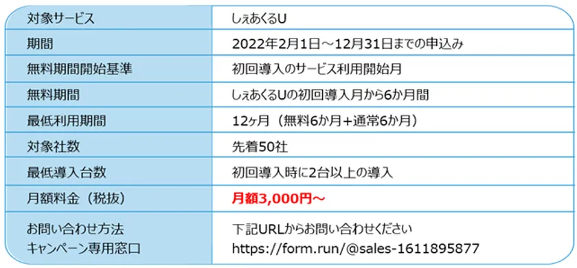 通常月額料金3,000円からのところ、しぇあくるU発売記念として初回導入から6ヶ月間は月額料金0円でご提供します。