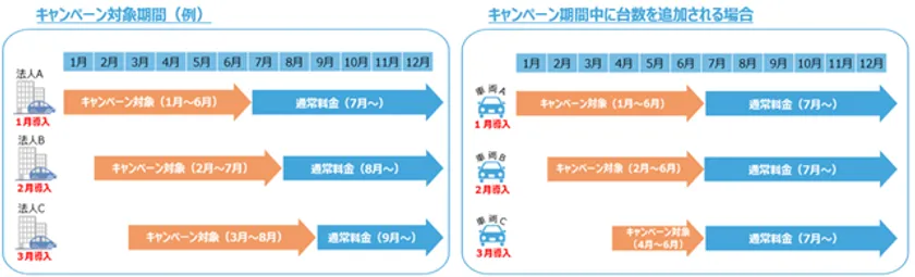 1つの法人様の中でキャンペーン期間中に台数を追加された場合は下記右図の通り、キャンペーンの適用となります。