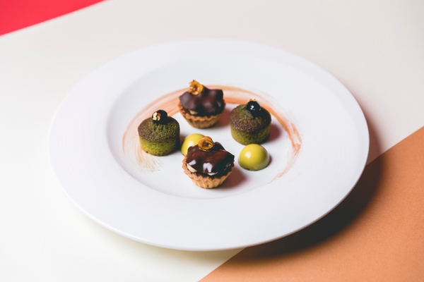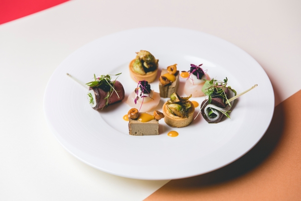 キッシュの具材に芽キャベツとトリュフを詰め込み秋らしい味わいに。りんごのコンポートを上に乗せ、食べ終わりに軽く感じる一品。