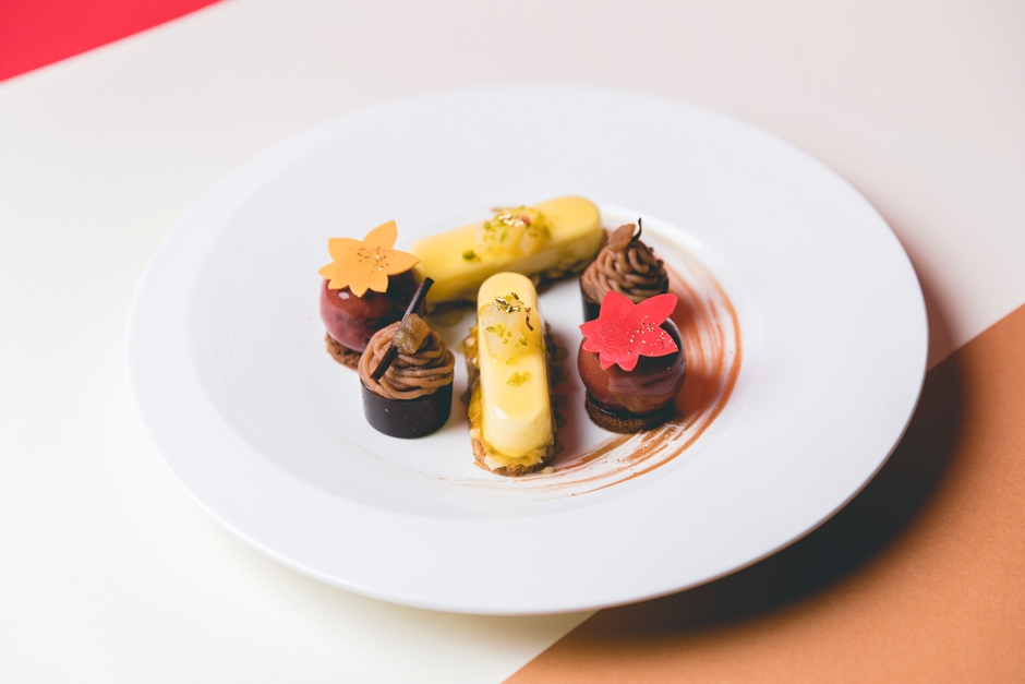 ペストリーシェフのジェニー・チュウが奏でる、秋に美味しさを増す洋梨や栗などのフルーツと少し肌寒さを感じる季節にぴったりなチョコレートのコンビネーションが楽しめるスイーツをお楽しみいただけます。
