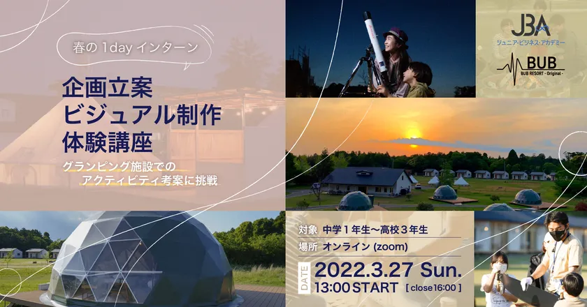 将来に繋がる学びと成長を提供する10代からのオンライン・キャリアスクール「ジュニア・ビジネス・アカデミー(運営:株式会社SEKAISHA)」と、アクティビティを通した体験を凝縮し、物事の意義・本質を探る探究心を育てるグランピング施設「BUB RESORT」がコラボレーションし、リアルな企業課題に挑戦する中学1年生~高校3年生向けの「企画立案・ビジュアル制作 体験講座」を[春の1dayインターン]として2022年3月27日に開催します。2月8日より先着順でお申込み受付を開始しました。