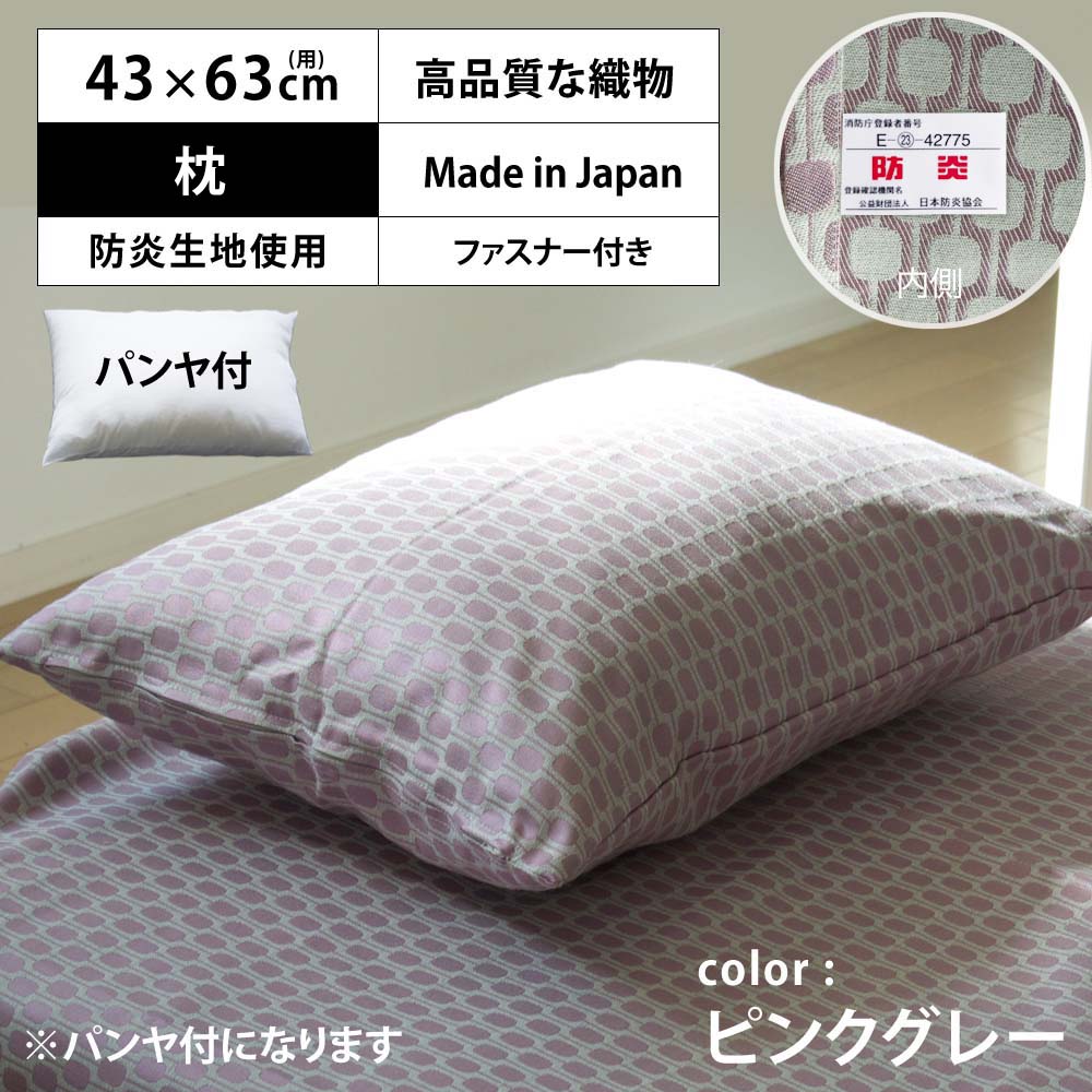 枕 カバー 防炎 加工生地 ピンクグレー (パンヤ付) 日本製 ジャガード織物 高級 ピローケース ファスナー付 43×63cm