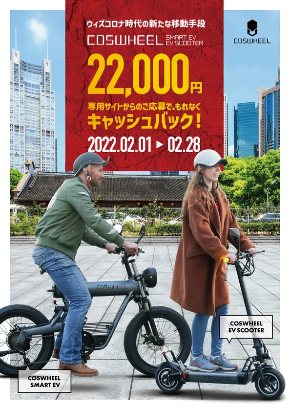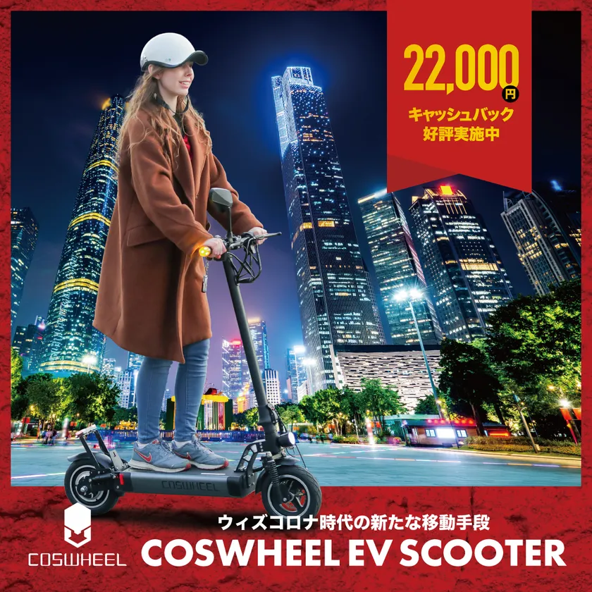 全国でオミクロン株による感染が拡がり、「第6波」の渦中にある今や、“ウィズ・コロナ”時代に「新しい生活様式」による感染対策が打ち出されました。その中、もっとも重要な事項は皆さまが自分自身を、そして人と社会を守るために今すぐ実行できる「ソーシャルディスタンス」になります。Acalieは、2021年に自転車でも原付スクーターでもない新しい電動ハイブリッドバイク「COSWHEEL SMARTEV」を発売し、エコ性・利便性の高い次世代パーソナルモビリティの普及をけん引してきました。今回の施策としては、“ウィズ・コロナ”時代に「3密」を避けて都市部に機動力抜群なCOSWHEEL電動バイク・電動キックボードを購入頂く場合に、2万2千円キャッシュバックの形で、「ソーシャルディスタンス」対策を支援します。