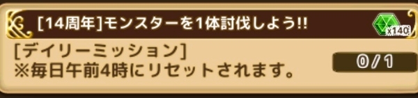 期間中は限定デイリーミッションで1日1回ログインしモンスターを1体討伐するだけでガチャ宝石が獲得でき、毎日クリアすれば合計でガチャ14回分のガチャ宝石が貰えます。