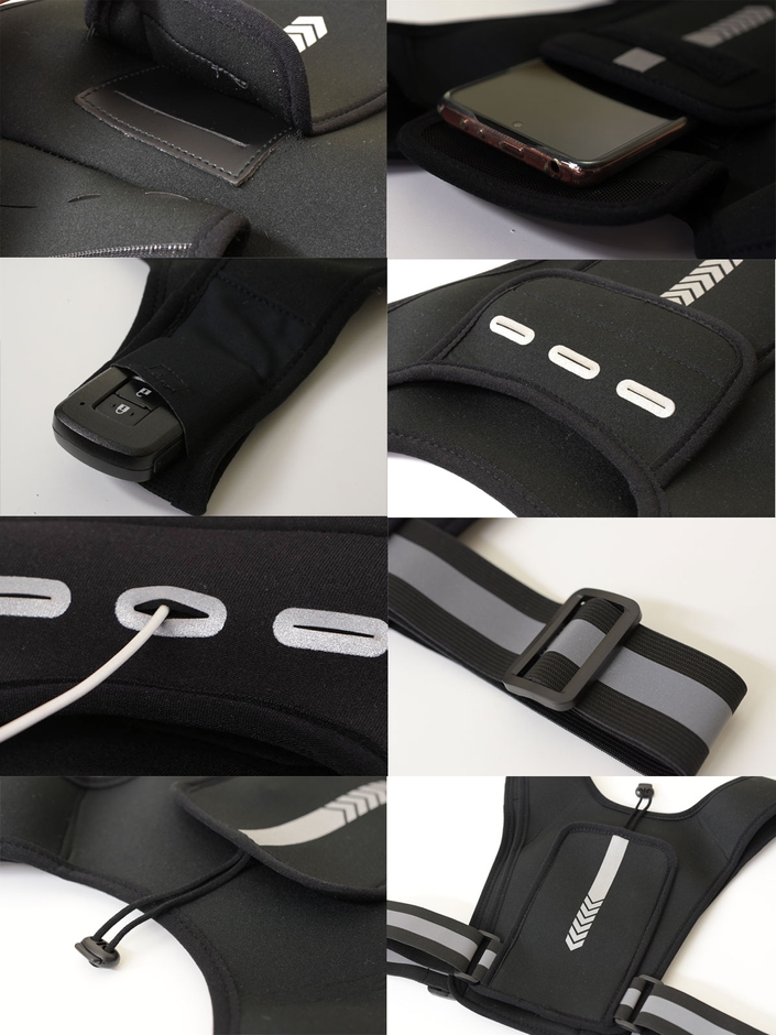 腕やウエスト部に収納するタイプと比較し、伸縮性の有るネオプレーン生地とサイズ調整可能なベルトによって、胸・肩・背中にピッタリとフィットするベストは、上下左右あらゆる方向の揺れに強く、スマートフォンやペットボトルの気になる揺れを抑えます。