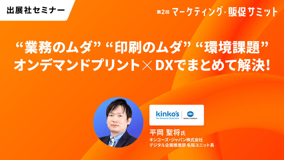 キンコーズ・ジャパン株式会社(本社:東京都港区、代表取締役社長:渡辺 浩基、以下 キンコーズ)は、2022年2月16日(水)〜18日(金)に開催される、オンライン展示会「第2回 マーケティング・販促サミット」の営業支援カテゴリに『オンデマンドMPM(Marketing Print Management)』を出品します。 この展示会は、あらゆる販促製品・マーケティング・営業支援サービスを対象とした、BtoB向けオンライン展示会です。