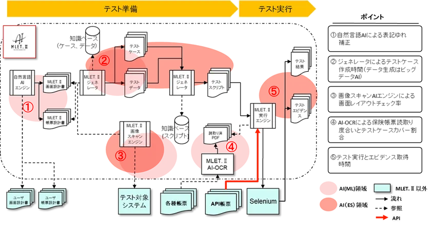 「MLET.II」はこれまで手作業で作っていたテストシナリオ、テストスクリプト、テストデータが自動で出力され、テスト自動実行ツールへも自動連係するAIアプリケーションです。