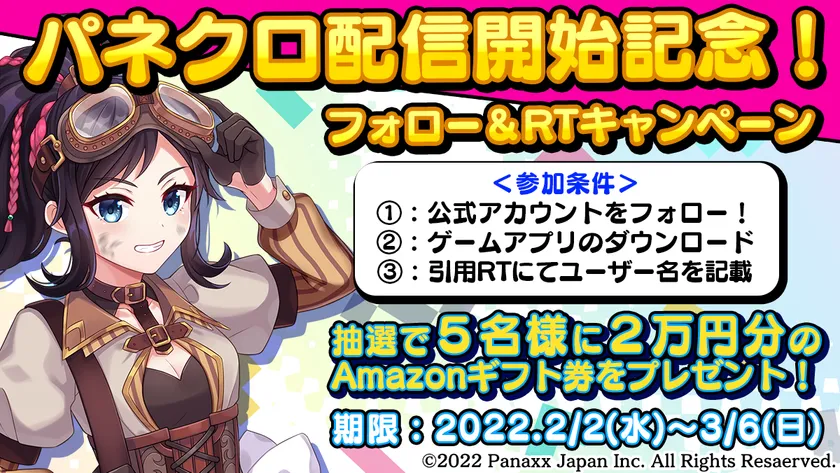 Twitterではゲーム配信開始までゲーム内容の紹介、今後は大会情報や対戦テクニックなどの各種情報発信を行います。公式アカウントではゲーム配信開始を記念して、フォロー&RTキャンペーンを実施中!キャンペーン参加者の中から抽選で5名様にAmazonギフト券2万円分をプレゼント!