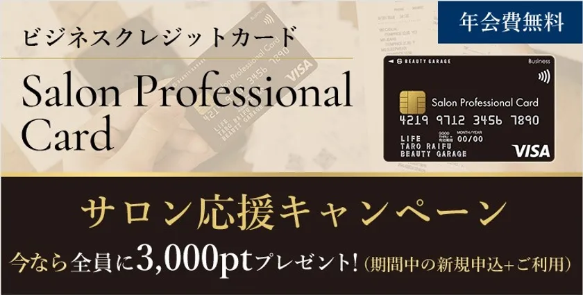 Salon Professional Card(サロンプロフェッショナルカード)は、理美容・エステ・ネイルなどの美容サロンを経営する事業者さまやフリーランスの方向けのビジネスカードであり、ビューティガレージでのお買い物はもちろんのこと、他店でのお買い物でもBGポイントがたまる、事業費決済専用のビジネスカードになります。