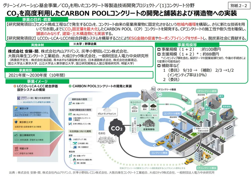 建築/土木/舗装の枠を超えて、脱炭素社会に貢献するCP(Carbon Pool)コンクリート・プロジェクトが始動、RRCS(一般社団法人 生コン・残コンソリューション技術研究会)の会員企業がコンソーシアムを形成し応募したNEDO・グリーンイノベーション基金事業に採択されたことをお知らせいたします。