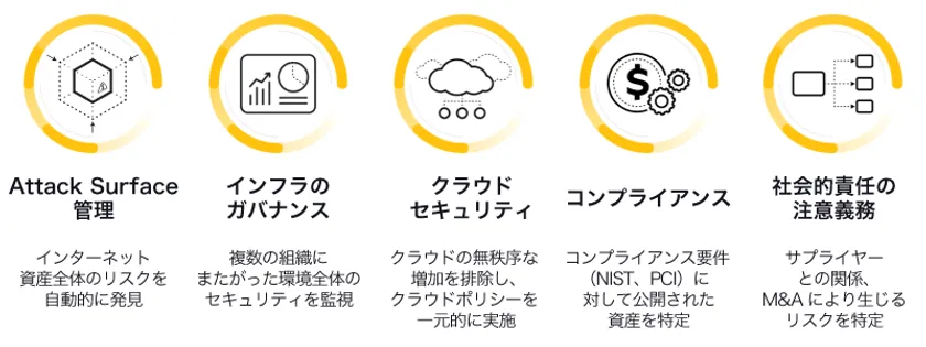 パロアルトネットワークスの特許取得済みのテクノロジーにより、リモートデスクトップ、Telnet、シャドーIT、IT資産の増減、古いIPアドレスの記録、証明書の暗号化された弱点、未使用のDNS、関連するクラウド上のIT資産、脆弱なデバイス、テレワーカーによる誰もが使えるITスペースなどでリスクを特定・評価し、修復することが可能となります。