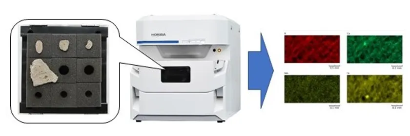 ・HORIBA製品の蛍光X線分析※2装置を用いて、軽石に含まれる元素の種類や量などのデータを測定します。