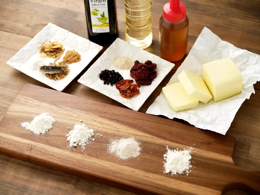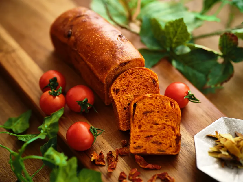 うま味成分の強いトマト、玉ねぎのうま味を塩に移した自家製塩、まほろばのあご出汁。そしてそれらをつつみこむ、埼玉県産小麦ハナマンテン。3種のうま味が掛けあわされ、より上質な深みのある食パンに仕上がっています。