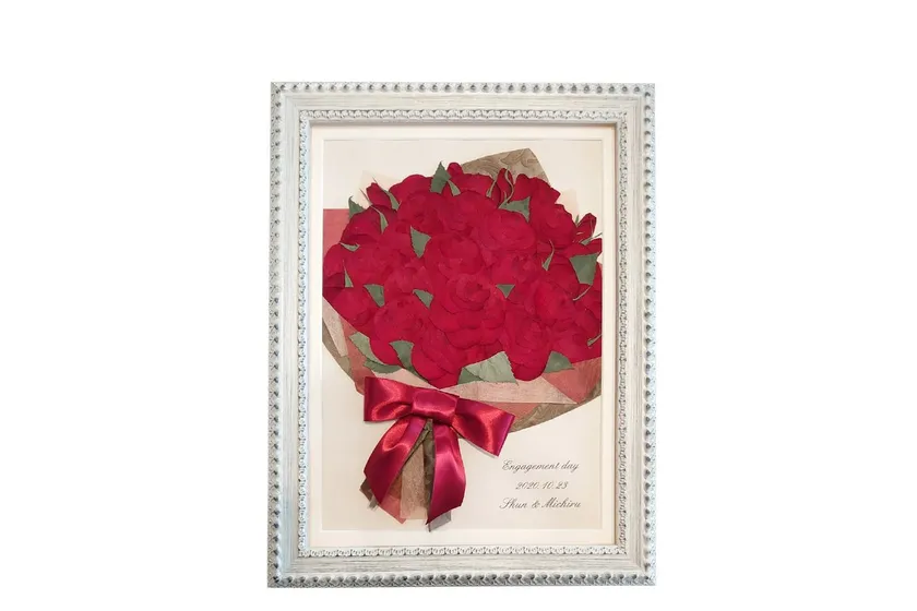 花嫁様が結婚式で使った生花の花やプロポーズの花束を、特殊なドライフラワーの加工にて半永久的に保存します。保存方法はガラスや3D(立体)額、押し花など、40種類以上の中から制作が可能で、種類の豊富さが特徴です。最近はプロポーズの花束で108本のバラを残す特注額での制作依頼も増えております。