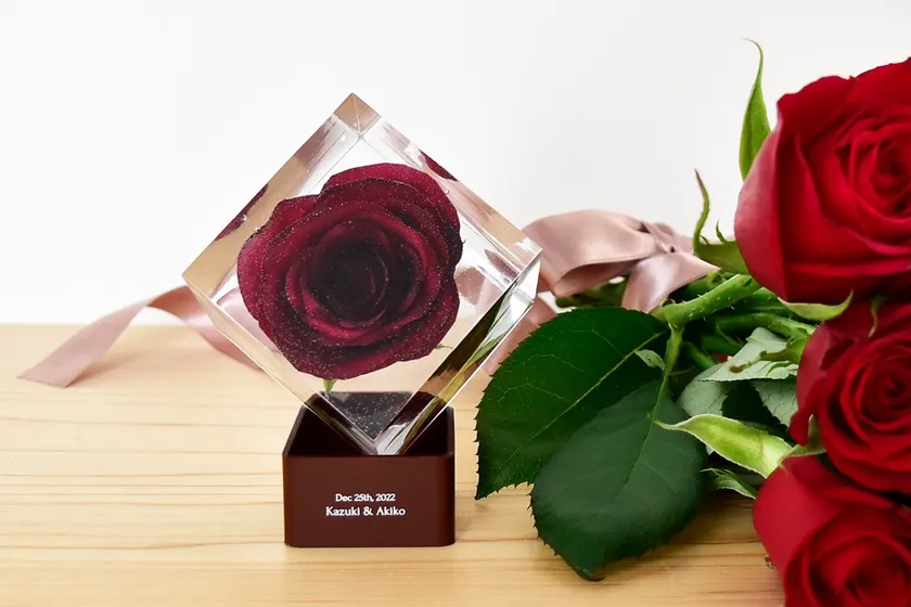 クリスタルフラワーは、透明度の高い樹脂に花を閉じ込めることで、かけがえのない瞬間を30年以上楽しむことができる保存方法です。