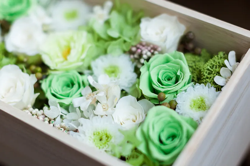プリザーブドフラワーは、生花を特殊な液体に浸けて色を抜いた後に、保存剤の入った染料で着色加工したフラワーギフトです。生花のような質感を長く楽しめることが特徴で、面倒なお手入れが不要なためプレゼントに向いています。