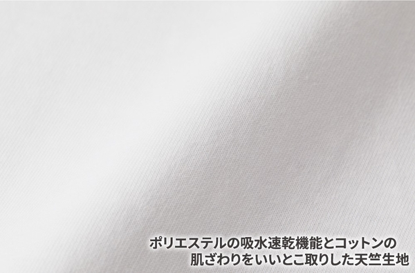 汗をすばやく吸い上げて拡散することで、さらりと快適な状態を持続する、吸水速乾機能付き。ポリエステルの機能性の高さと、コットンのなめらかでやわらかな肌ざわりといった、両者のいいとこ取りをした一枚です。さらに機能性に軸足を置きながらも、サイジングやカラースプレッドにはストリート的な価値観を落とし込みました。ほどよくゆとりを持たせつつ、品良くシャープにまとまった佇まいに仕上げました。「機能性も重視したい」「都会的な空気もはらんだ着こなしをしたい」といった、これまで両立させることの難しかった要望を叶えてくれるリアルクローズアイテムです。