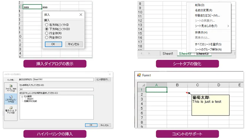 Excelと同等のショートカットキーを使用できるようになることで、[Ctrl]+[1]キーで「セルの書式設定」、[Ctrl]+[K]キーで「ハイパーリンクの挿入」、[Ctrl]+[Shift]+[+]キーで「挿入」といったダイアログの表示が可能です。また、Excelと同じような操作感で、シートタブの右クリック時にコンテキストメニューを表示できるようになりました。[Ctrl]+クリックで複数のシートタブを選択し、「削除」「非表示」といったメニューを同時に実行することもできます。