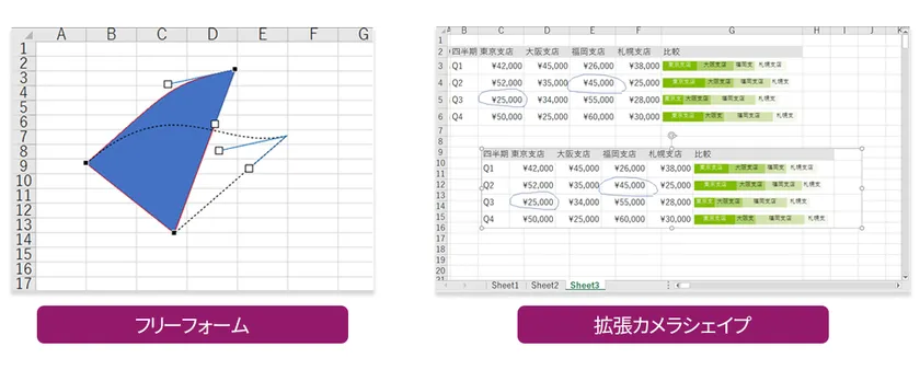さらに、シート上でマウスをドラッグしてなめらかな曲線を描いたり、定形外の図形を描いたりできるフリーフォームに対応しました。また、シート上の任意の範囲をキャプチャしシェイプとして表示することができるカメラシェイプの拡張版を追加しています。拡張カメラシェイプでは、15.0Jで追加されたフリーフォーム、スパークラインなどの機能やスタイルのキャプチャも可能です。