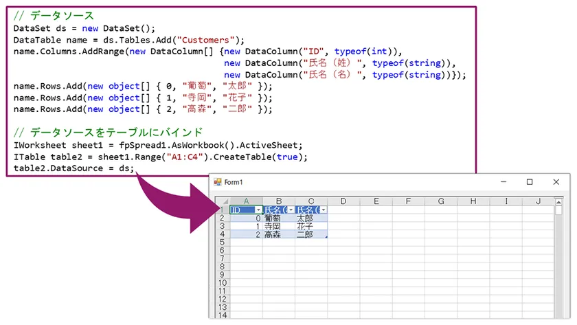 任意のデータソースを直接テーブルへバインディングできるようになりました。同じテーブルを複数作るときなど、従来の方法に比べ非常に簡単に実装できます。