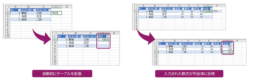 テーブルに隣接するセルに値を入力すると、新しい行や列がテーブルに自動で追加されます。また、空のテーブル列に数式を入力した場合、入力された数式で列全体を埋めることもできます。