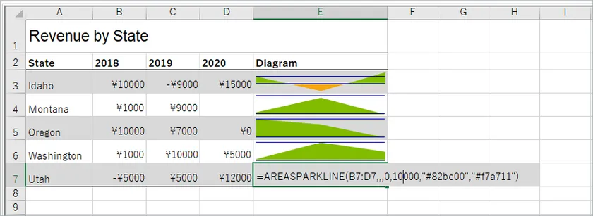 従来のスパークライン機能に加えて、セルに数式を設定してスパークラインを作成できる機能を搭載しました。面や円、散布図、ブレット、積み上げなど多くの種類をサポートしています。データを可視化することで、より訴求力の高いデータ表示が可能です。