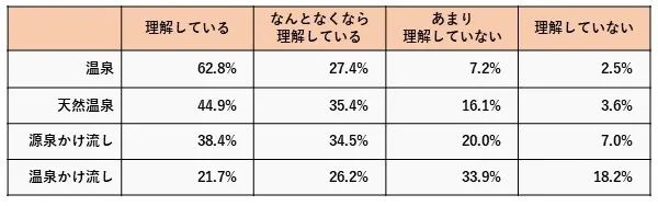 「温泉かけ流し」に関しては、理解していない割合の方がやや高くなっており、言葉自体聞いたことがないという方も多かったかもしれません。