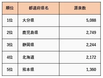一方で源泉数(未使用の源泉数も含む)となると、大分県が圧倒的に1位となっています。