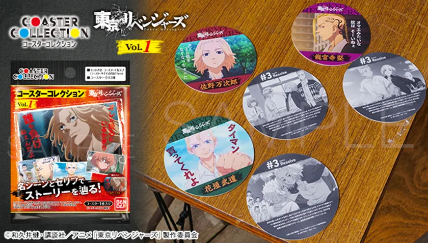 株式会社バンダイ ライフ事業部では、高級感のあるマットコートを施した紙製コースターシリーズ『コースターコレクション』より、TVアニメ『東京リベンジャーズ』の場面写を潤沢に使用した『コースターコレクション 東京リベンジャーズ Vol.1』(各110円 税込)と、『コースターコレクション 東京リベンジャーズ Vol.2』(各110円 税込)を2022年2月16日(水)に発売いたします。