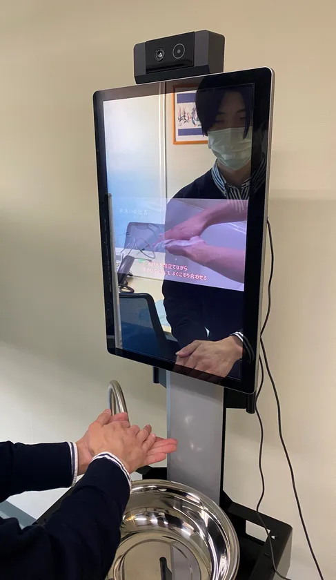 予め登録されたスタッフが専用ミラーの前に立つことで起動し、問診と手洗いの精度を計測。ムービーや管理者からのお知らせを配信することも可能です。