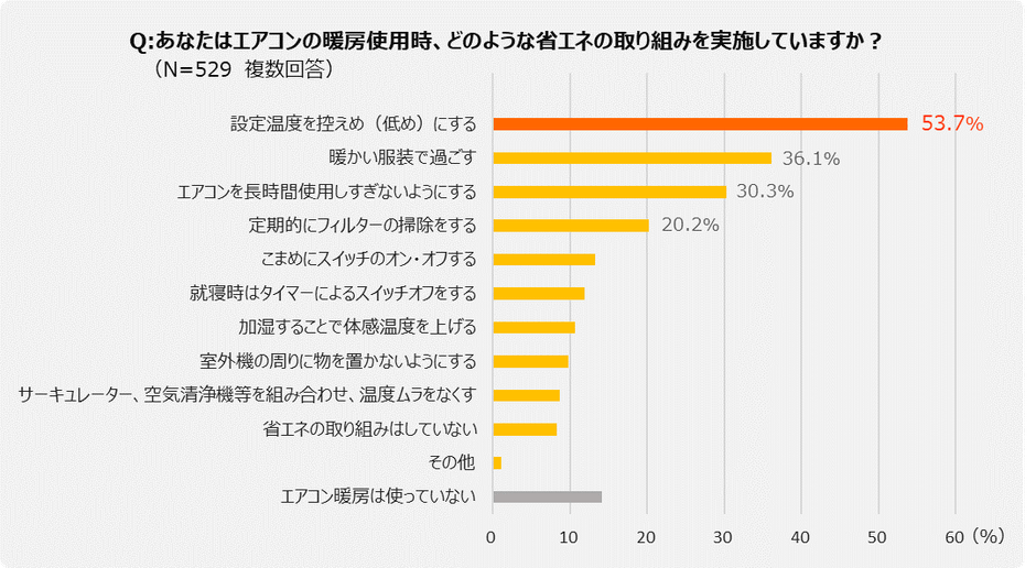 また、冬場によく使われるエアコンですが、「エアコンの暖房使用時、どのような省エネの取り組みを実施していますか︖」という回答に対して、「設定温度を控えめにする(53.6%)」「暖かい服装で過ごす(36.1%)」、「エアコンを長時間使用しない(30.2%)」との結果になりました。設定温度や使用時間を制限することで消費電力を抑えようとする人が多いようですが、時には省エネのために寒さを我慢しているのかもしれません。「定期的にフィルターを掃除する(20.2%)」や「加湿をする(10.6%)などの省エネ対策も実践し、電気代を抑えながら、快適に寒い冬を過ごす方法を知っていただきたいと思います。