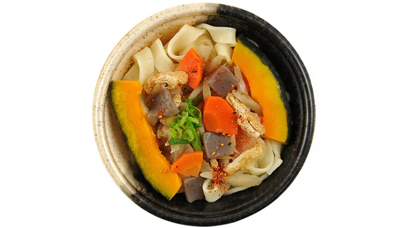独特の平たい幅広麺線のもちもちしたうどんに、存在感のあるかぼちゃ煮と野菜をトッピング。だしに拘ったほうとう専用味噌スープがポイント!