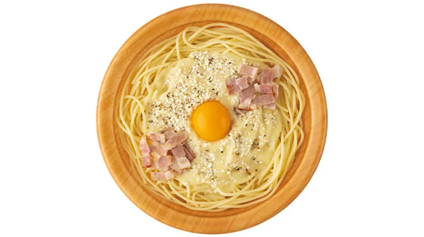 濃厚なミルク仕立てのカルボナーラソースと香りのよいパルメザンチーズを麺に絡め、卵黄とベーコンをトッピング。ブラックペッパーの香りもポイント!