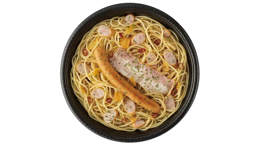 しっかりと味の入った面にニンニクの効いたペペロンソースで炒め、フライドガーリックと存在感のあるウインナー1本とソーセージ・ベーコンスライスをトッピングした、食べ応え抜群の大盛パスタです。