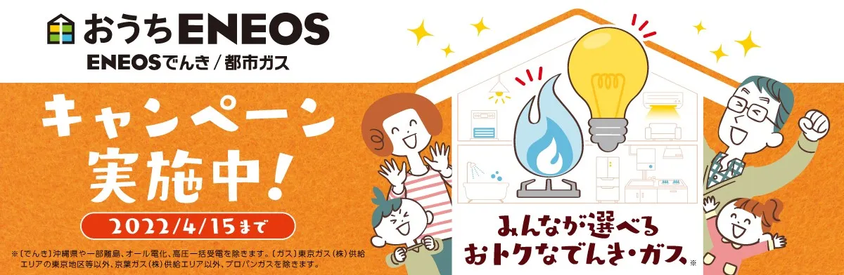当社(社長:大田 勝幸)は、本日2月1日(火)から4月15日(金)の間、「ENEOSでんき」「ENEOS都市ガス」のキャンペーンを実施いたします。また、本日より、「ENEOS都市ガス」としては初めて事業エリアを拡大し、京葉ガス株式会社供給エリアへの販売も開始しますので、あわせてお知らせいたします。