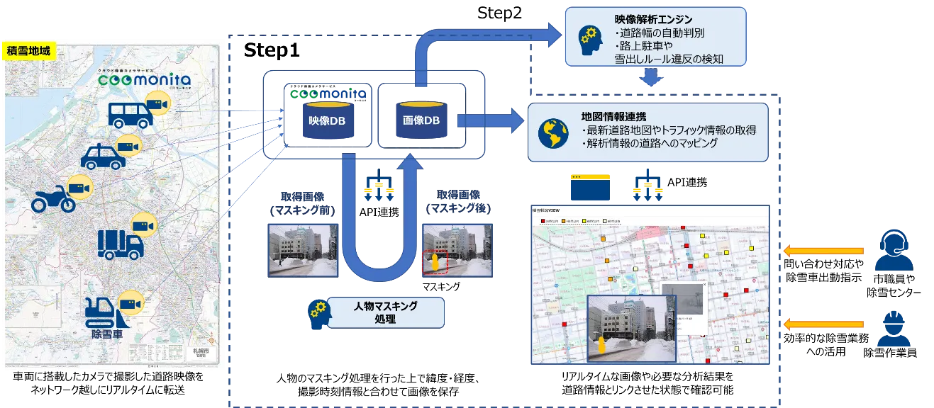車載したクラウド録画カメラサービス「coomonita (コーモニタ)」(※3)で撮影した映像を加工し、HERE TechnologiesのHERE Maps APIを活用しリアルタイムに地図上へマッピングします。本実証実験は以下の2ステップにて行います。