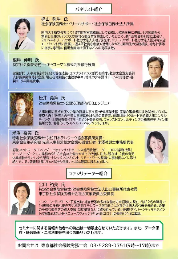 そこで、『コロナ後の人が集まる企業の働き方』として、テレワーク、短時間正社員、兼業・副業など従来とは違う新しい働き方をテーマに、最近多い事例、成功例・失敗例等を交えながら、導入のポイントや注意点について、4名の社会保険労務士が解説します。