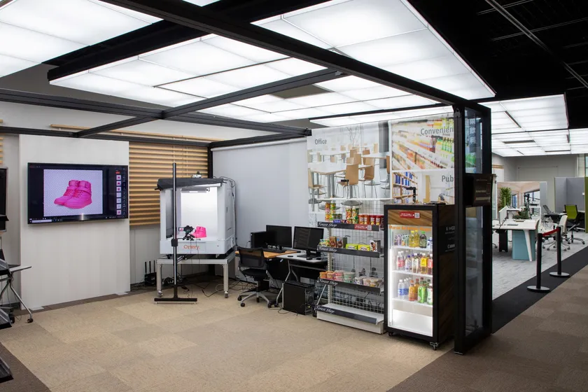 2021年11月より品川キヤノンSタワーに新設された「CANON INNOVATION LAB “WITH”」では、最新のDXソリューションなどをリアルとオンラインのハイブリッド環境で体感することができる最新のショールームです。3階のソリューションデモスタジオに中型の自動撮影機「3D PhotoBench 280」が常設され、製品のデモを体感することができます。同デモスタジオには、POPシステムや無人店舗システムなどが並び、流通小売に関係する様々なソリューションを一度に見学することができます。